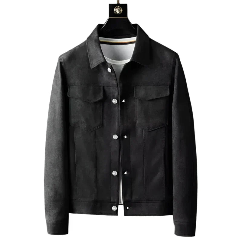 Elevate your casual layering with this suede-look trucker jacket, perfect for Canada’s mild spring and fall weather. Crafted in a soft faux suede finish with classic snap button detailing, this lightweight outerwear piece delivers a clean, structured fit. Designed for versatility, it easily pairs with jeans or chinos for effortless street-to-smart styling.