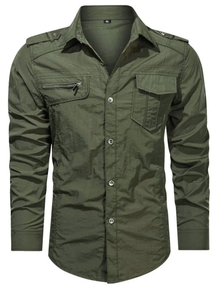A rugged military-inspired shirt designed for Canadian everyday wear and work settings. Featuring a durable cotton blend, flap chest pocket, and an added zip pocket for modern utility, it blends function with structured style. Perfect for layering or wearing solo.