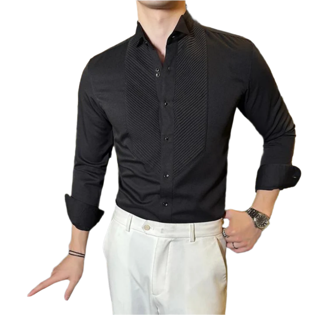 Men's Formal Dress Shirt | Pleated Tuxedo Front | Slim Fit Black Long Sleeve