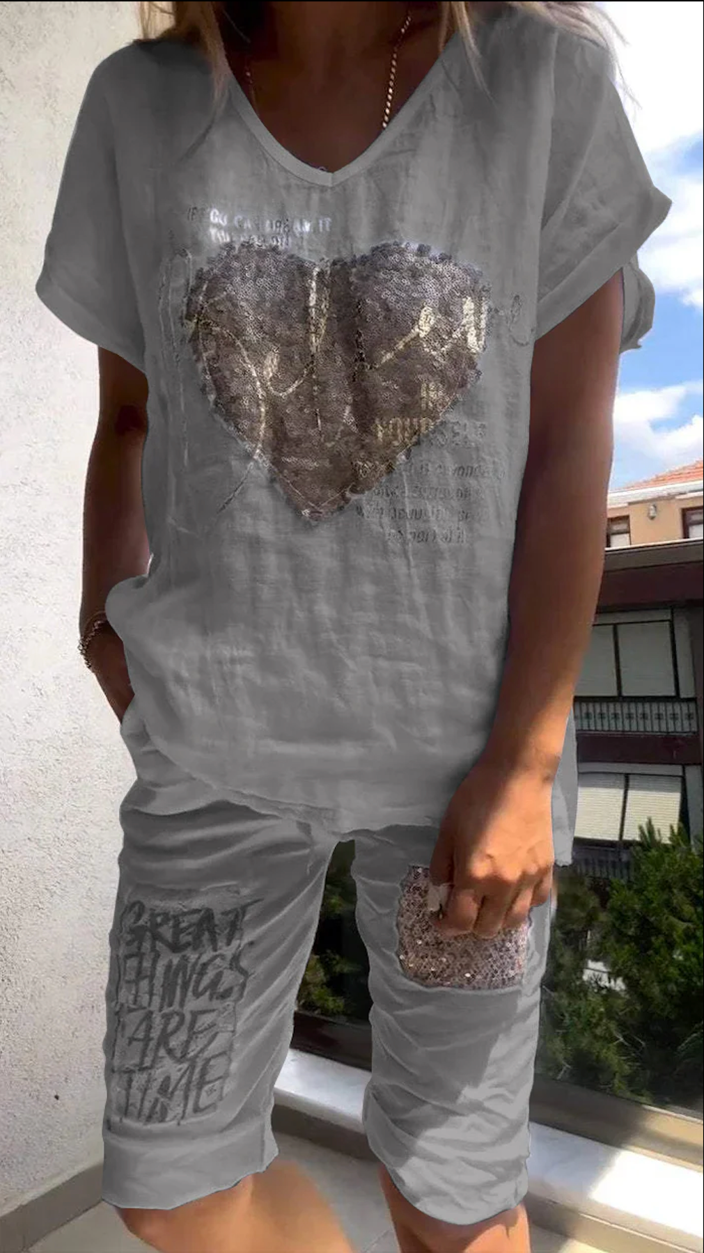 This two-piece set features a flattering V-neckline and delicate gold embossing, adding a touch of sophistication to your casual outfit. Crafted from cotton and linen, it offers lightweight, breathable comfort, making it ideal for summer days. The matching shorts perfectly complete this chic and comfortable look, perfect for any casual occasion.