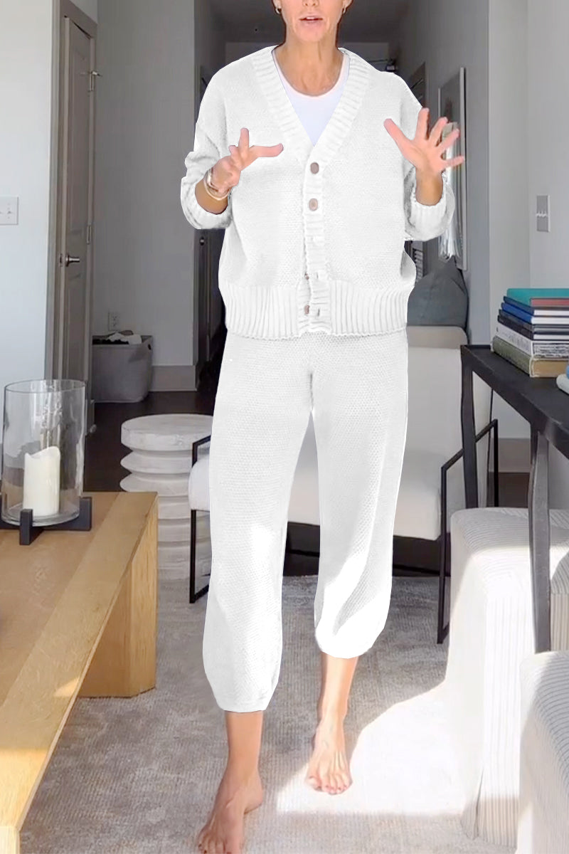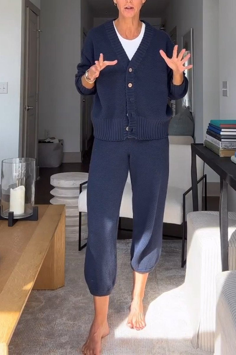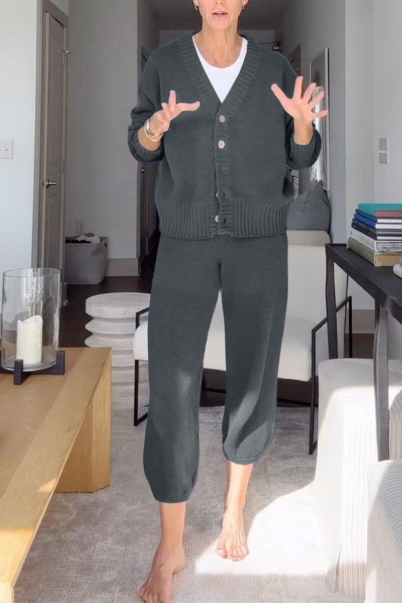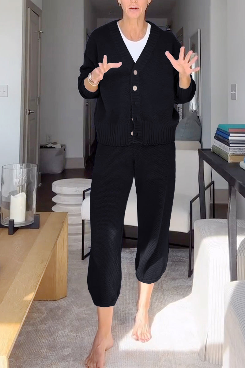 Modern and elegant style : The V-neck button-down cardigan and tapered pants create a harmonious and sophisticated outfit.