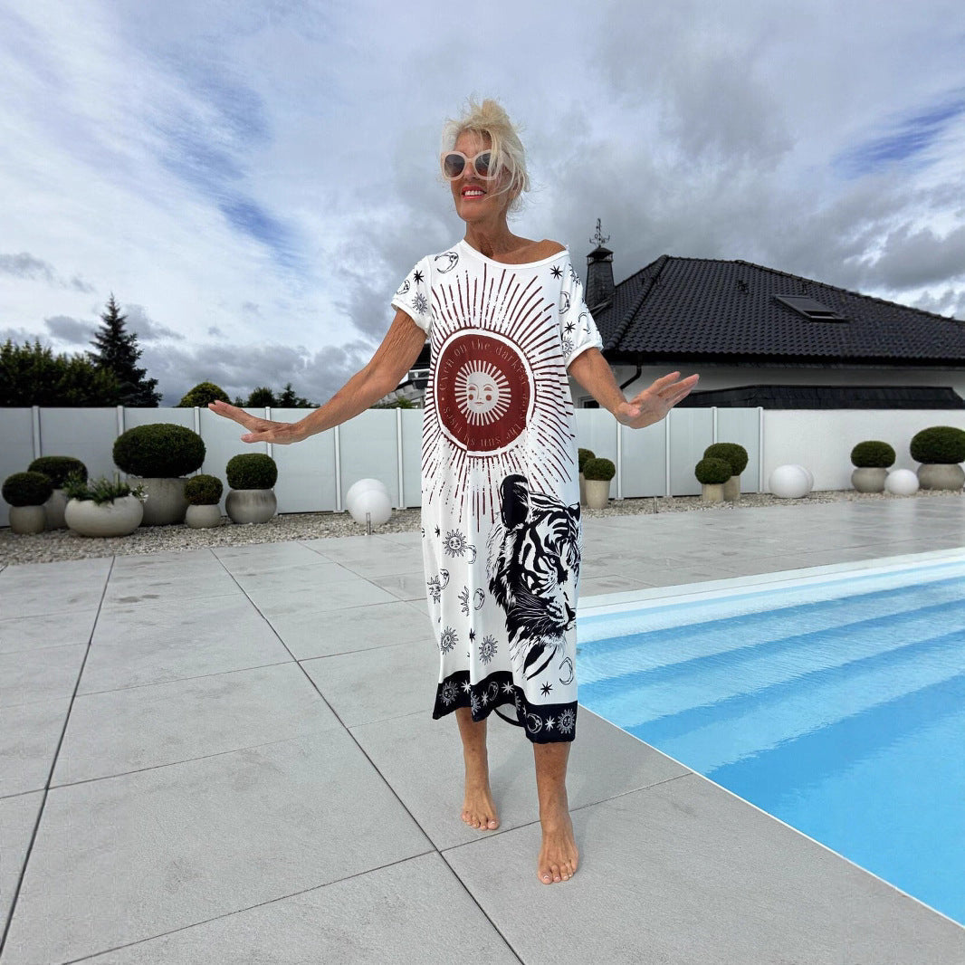 With its airy short sleeves, flowing fabric, and prints inspired by the sea, sun, and nature, this maxi dress is a true ode to summer. It combines absolute comfort and summery style to accompany you from the beach to a stroll. Available up to 5XL, it celebrates all body types with charm and softness.