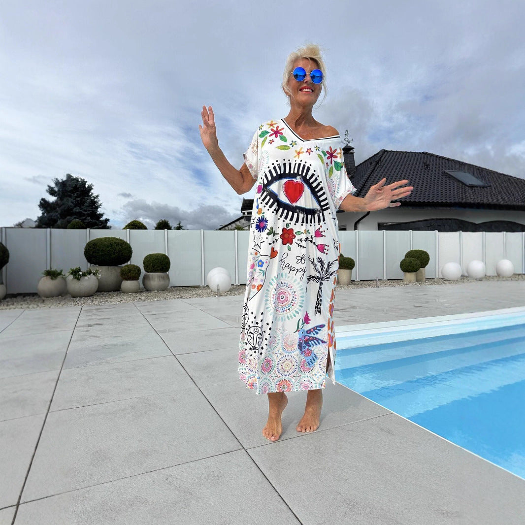 Cerelina - Women's summer dress with short sleeves and V-neck, with print